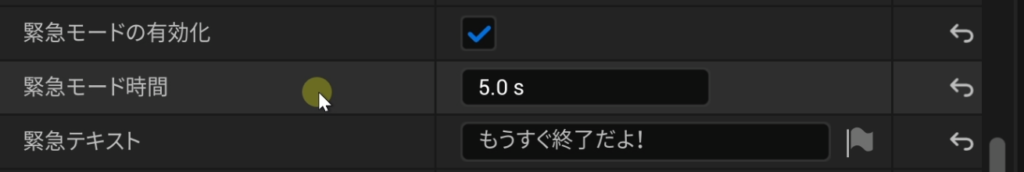 - 緊急モード関連: 緊急モードの有効化をTrueにすると、指定した時間(緊急モード時間)になると警告音を鳴らし、文字色を赤などに変更できます。
