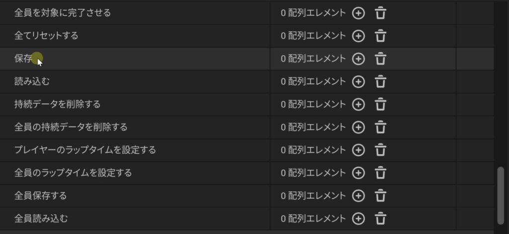- 持続データ関連(保存, 読み込む): オートセーブ/自動読み込みをオフにしている場合、特定のタイミングで手動でセーブ/ロードを実行させるために使います。